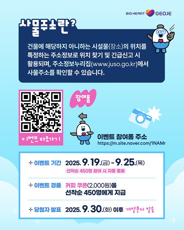 거제시는 9월 19일부터 25일까지 사물주소 인증사진 경품 이벤트를 진행한다고 밝혔다.