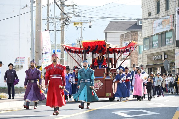사또부임행차는 취타대의 웅장한 연주를 시작으로, 기수와 군관을 선두로 한 행렬이 먼저 모습을 드러냈다. 뒤이어 근엄한 신관사또를 비롯해 익살스러운 이방과 육방, 화려한 의상의 기생, 거제면 주민자치회 위원과 프로그램 회원, 어린이 태권도단, 사물놀이패, 시민 길놀이 참가자 등 250여 명이 참여해 기성관에서 농업개발원까지 행진하며 흥겨운 볼거리를 선사했다.
