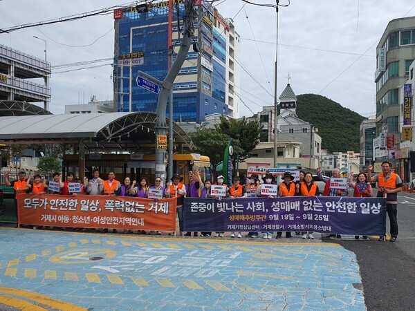 거제가정상담센터(센터장 임귀숙)는 지난 23일 ‘성매매추방주간(9.19~9.25)’을 맞아 거제시청, 거제경찰서, 거제소방서 의용소방대, 시민 자원봉사자 등 30여 명과 함께 민·관·경 합동 거리 캠페인을 진행했다.