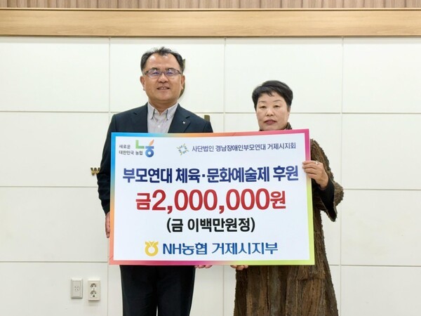 NH농협 거제시지부는 14일 ‘제5회 체육문화예술제’를 응원하고 발달장애인의 문화예술 발전을 위해 (사)경상남도장애인부모연대 거제시지회에 200만 원을 전달했다.