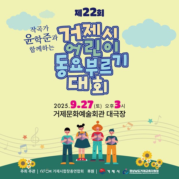 대한민국을 대표하는 가곡·동요 작곡가 윤학준과 함께하는 제22회 거제시 어린이 동요부르기 대회가 오는 9월 27일(토) 오후 3시, 거제문화예술회관 대극장에서 개최된다.
