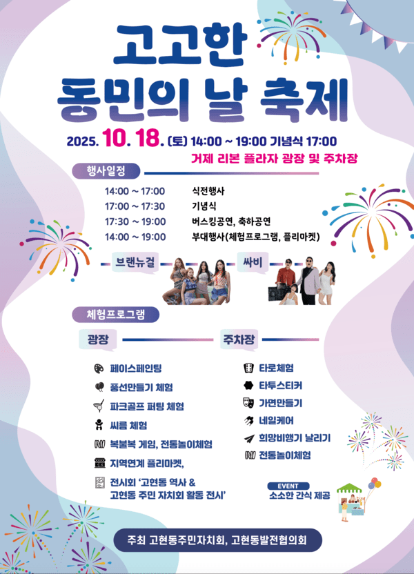 이번 축제는 주민자치사업인 고고한 축제와 동민의 날을 합쳐 고현동민의 화합을 하나로 모인 자리로, 체험부스, 플리마켓, 축하공연 등 다채롭게 마련할 예정이다.
