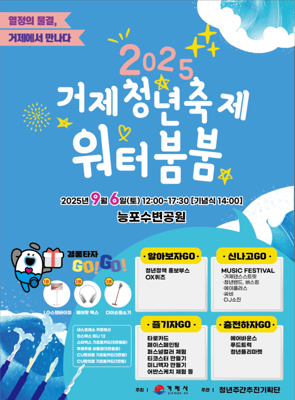거제시는 오는 9월 6일(토) 능포수변공원에서 「2025 거제청년축제 워터붐붐」 행사를 개최한다.