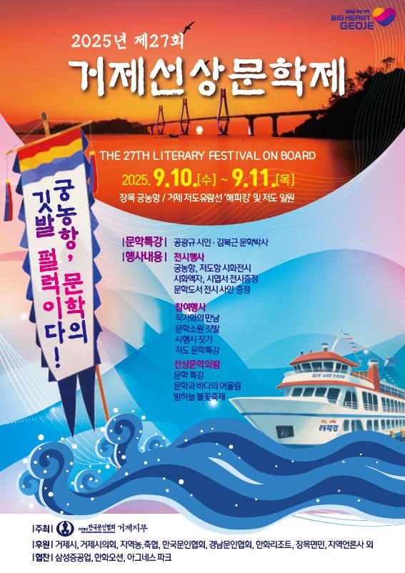 박영순 한국문인협회 거제지부장과 원순련 추진위원장은 “거제선상문학제는 27년의 전통을 이어오며 단순한 문학행사를 넘어, 거제의 바다와 섬이 가진 문화적·자연적 자산을 예술과 결합해 새로운 문화 축제로 발전해왔다”고 전했다.