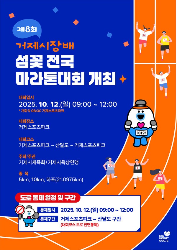 거제시민과 전국 마라톤 동호인들이 함께하는 「제8회 거제시장배 섬꽃 전국마라톤대회」가 오는 10월 12일(일) 오전 9시 거제스포츠파크에서 열린다. 이번 대회는 거제시체육회가 주최하고 거제시육상연맹이 주관하며, 총 6,600여 명이 참가하는 대규모 생활체육 행사다.