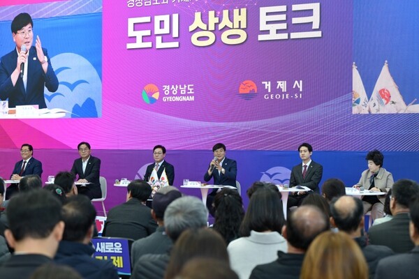 박완수 도지사가 18일 거제 반다비체육센터에서 열린 ‘도민 상생토크’에서 기업혁신파크, 광역교통망, 미래산업 등을 연계한 성장전략을 제시하며 “거제가 남해안 관광휴양과 미래산업의 핵심축으로 도약할 수 있도록 경남도가 적극 뒷받침하겠다”고 밝혔다.