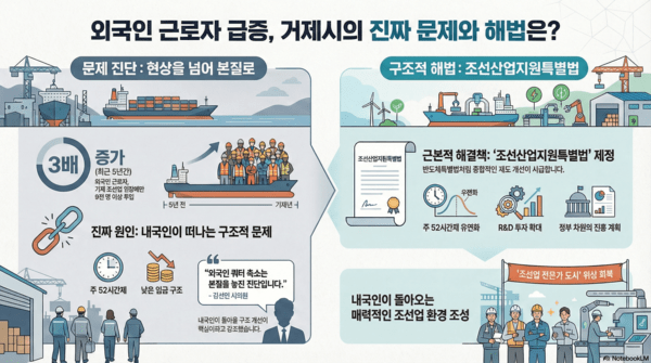 한편 최근 5년간 거제 지역 외국인 근로자는 약 3배 증가했고, 조선업 현장에만 9천 명이 넘는 외국인이 투입된 것으로 알려졌다. 이 같은 급증에도 불구하고 지방자치단체가 독자적으로 대응하기 어려운 구조적 한계가 지적되면서, 특별법 제정을 통한 근본적 해결책 마련이 필요하다는 목소리가 커지고 있다.