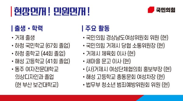 윤 예비후보는 거제시 여성기업인협회 회장과 거제시체육회 이사 등을 역임하며 지역 경제와 체육 발전을 위한 다양한 사회 활동을 이어왔다. 특히 소상공인과 자영업자, 생활체육인들과 현장에서 직접 소통하며 지역의 어려움과 민원을 가까이에서 살펴왔다.