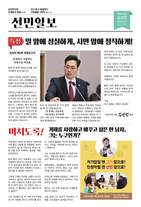 김선민 의원(국민의힘·거제시의회)이 시민과 함께한 지난 의정활동의 성과와 과제를 담은 제4호 의정보고서를 발간했다.