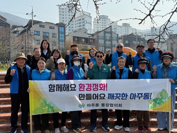 아주동 통장협의회(회장 박미애)가 지난 26일 따뜻한 봄을 맞아 관내 상가지역 일대에서 1회용품 사용 줄이기 및 올바른 분리배출 실천을 위한 환경보호 캠페인을 했다.