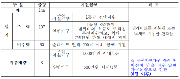 슬레이트를 지붕재 또는 벽체로 사용하는 주택 및 비주택(축사,창고) 건축물을 대상으로 해당 사업에 국‧도비를 포함한 사업비 총 5억 9500만원을 확보해 지붕개량 지원 8가구를 포함해 총 148가구 건축물의 노후 슬레이트의 철거·처리를 지원한다.