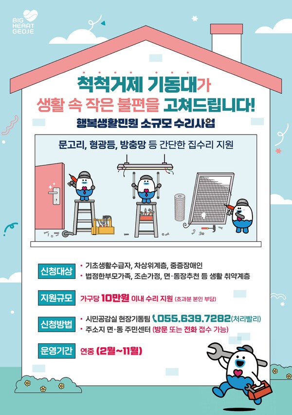 지원 내용은 문손잡이, 방충망, 형광등 교체 등 가정 내에서 발생하는 간단한 소규모 수리로, 생활 불편을 신속히 해소해 시민의 주거환경 개선과 생활 안정에 도움을 주는 데 목적이 있다. 수리는 척척거제 기동대가 직접 현장을 방문해 처리한다.