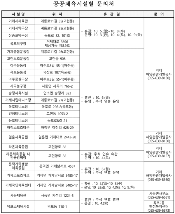거제시는 추석 연휴 기간 공공체육시설을 다음과 같이 운영한다. 실내 공공체육시설은 10월 5일(일)부터 8일(수)까지 휴관하며, 실외 공공체육시설은 추석 당일인 10월 6일(월) 하루만 휴관하며 7일(화)부터는 정상 운영한다.