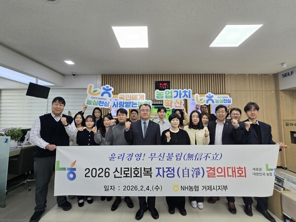 NH농협거제시지부(지부장 권경화)는 지난 4일 1층 객장에서 전 임직원이 참석한 가운데 ‘2026 신뢰회복 자정(自淨) 결의대회’를 개최하고 윤리경영 실천과 내부통제 강화를 통한 신뢰회복을 다짐했다.