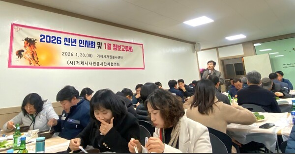 (사)거제시자원봉사단체협의회(회장 김창규,이하 협의’)는 지난 20일 거제시자원봉사센터에서 ‘2026 신년인사회 및 1월 정보교류회’를 성황리에 개최했다. 이번 행사는 병오년(丙午年) 새해를 맞아 자원봉사자 간의 결속을 다지고, 새로운 도약을 다짐하는 뜻깊은 자리로 마련됐다.