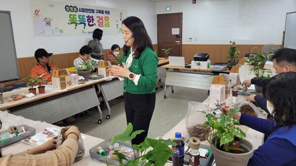 ‘원예심리 프로그램’은 우울감을 느끼는 당사자와 똑똑보안관이 함께 식물을 심고, 각자의 소감을 공유하는 모임으로 세 차례 진행했다. 낯설고 어색했던 분위기는 자연과의 교감과 식물 돌봄 활동을 통해 점차 부드러워졌고, 참여자들은 심리적 치유와 안정이라는 긍정적인 변화를 경험했다. 집단 활동은 대인관계 소통의 기회를 제공하고, 식물을 돌보며 책임감과 성취감을 맛봄으로써 정서적 안정과 우울감 완화에 큰 도움이 됐다.