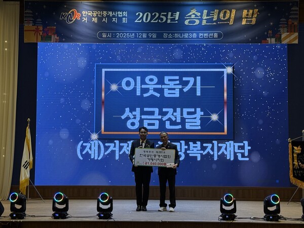 한국공인중개사협회 거제시지회(회장 최성록)는 지난 9일, 2025년 송년의 밤 행사에서 이웃돕기 성금 104만 원을 (재)거제시희망복지재단(이사장 이화수)에 기탁, 행복천사 제281호가 됐다.