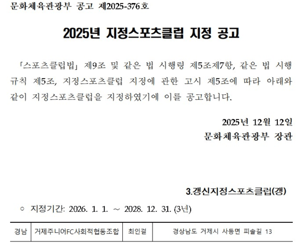 거제주니어FC 사회적협동조합, 문체부 지정 스포츠클럽 재지정